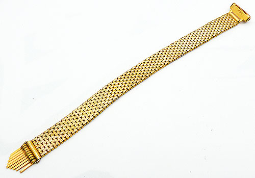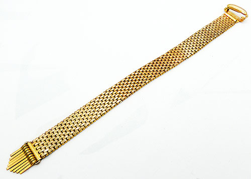 Description: Kreisler vintage gold plated brick link adjustable tassel bracelet; the band is made with nine rows of staggered interlocking brick links with a gold tassel at the end. The band is held in place with a fold-over clasp that locks down. Signed 'Kreisler USA Quality' on the back of the clasp.