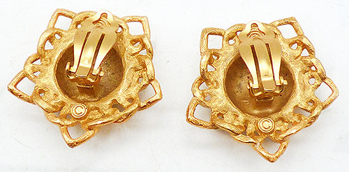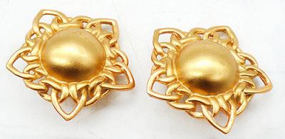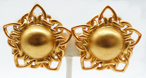 Description: Vintage 1980's matte gold plated starburst clip earrings; domed centers in the middle of interlocking chain link style sun rays in the shape of a five point star.