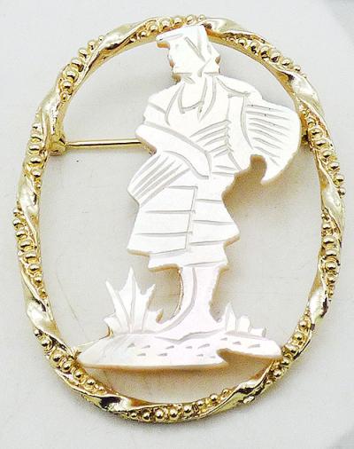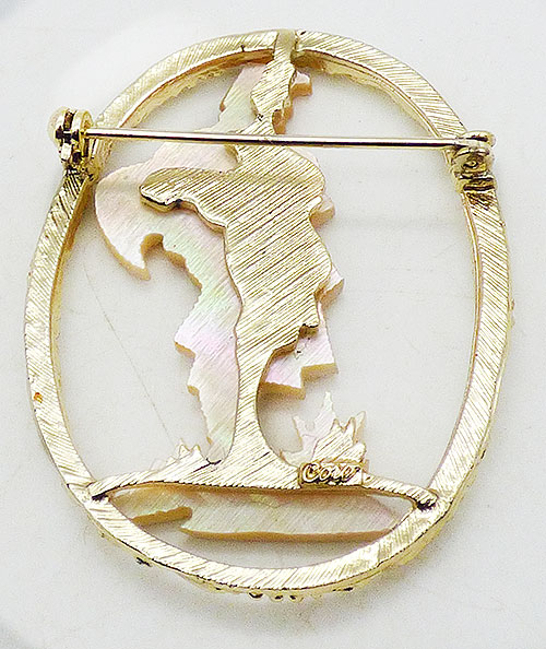 Description: Coro gold tone silhouette style brooch; a carved mother-of-pearl man carrying a harvest on a bed of leaves is mounted inside a twisted bead rope oval frame. Signed 'Coro' on the back.