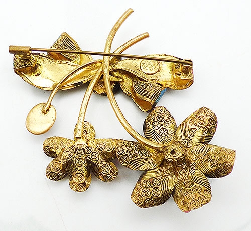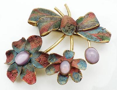 Description: Czechoslovakian vintage enameled floral bouquet brooch; a large unusual design with a cascade of three flowers in gold tone stems tied with ribbon bow at the top. The heavily textured and granulated metal has swirl and tiny bead patterns and is enameled in gradient mellow shades of blue and red. The centers of the two open flowers are oval lavender moonstone glass cabochons, as is the single bud. Signed 'Made in Czechoslovakia' on tha back.