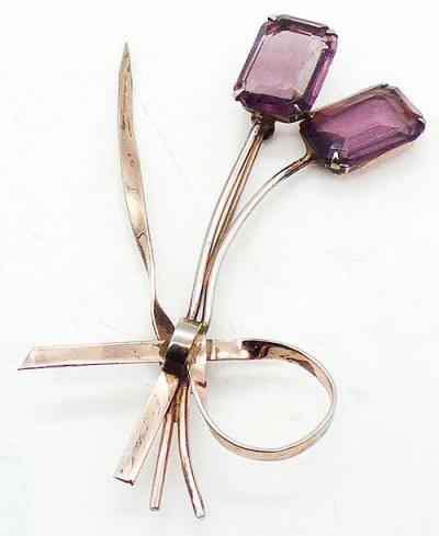 Description: Coro sterling silver vermeil delicate Retro floral brooch; two good-sized amethyst glass rectangle flowers on long stems with a long, narrow leaf off to one side. The small bouquet is tied with a narrow ribbon at the bottom. Signed 'Coro Stering' on block letters on the back.