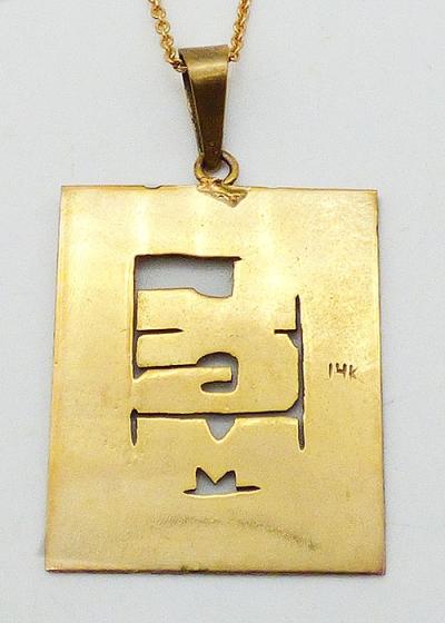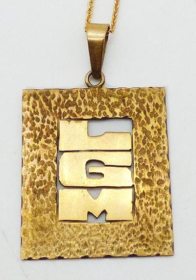 Description: Vintage 1970's 14k gold modernist monogram pendant; the rectangular pendant is on a 14k gold chain. The vertical monogram is made with a thick font "LGM" inside a roughly textured frame. Hallmarked 14K on the back of the pendant and on the jump ring of the clasp.