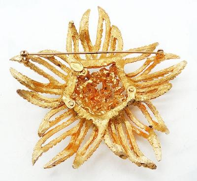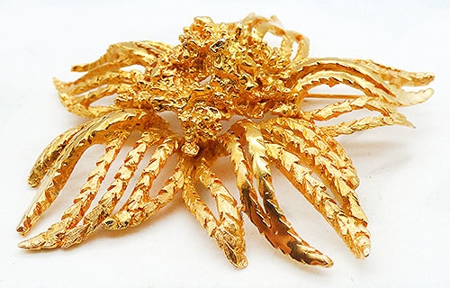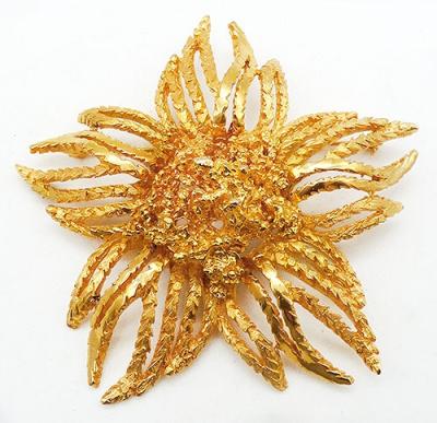 Description: Hattie Carnegie vintager gold plated enormous flower brooch; the domed center is a pile of heavily textured rough gold tone layers and the huge serrated edge petals are a combination of textured and polished gold finishes. Signed 'Hattie Carnegie' on the back.