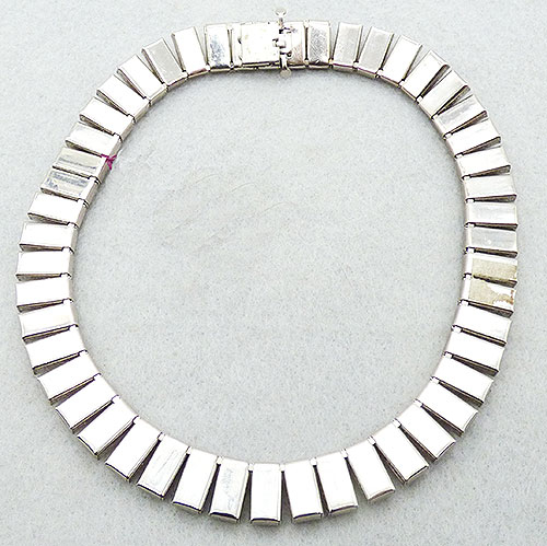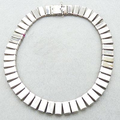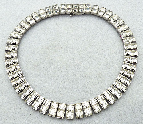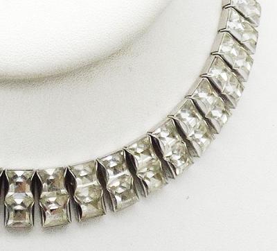 Description: Art Deco period silver tone clear rhinestone double link choker necklace; two rows of channel set square clear rhinestones set as pairs into rectangular links. Hidden push-in Art Deco period clasp. Note the smaller size, choker length, best worn high on the neck.