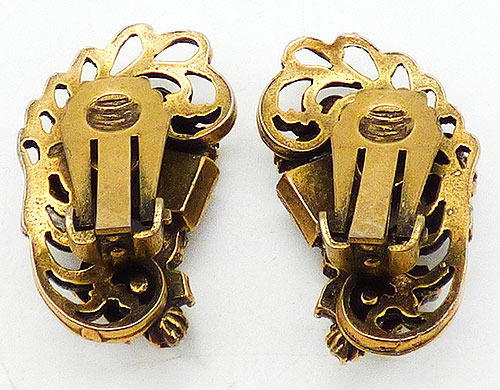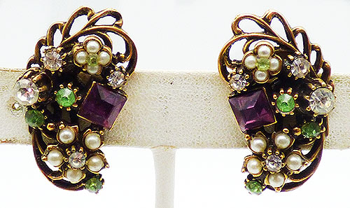 Description: Vintage gold plated filigree curled leaf clip earrings decorated with large and smaller faux pearl florets with clear rhinestone centers, a large square amethyst rhinestone and light green and clear rhinestone accents.