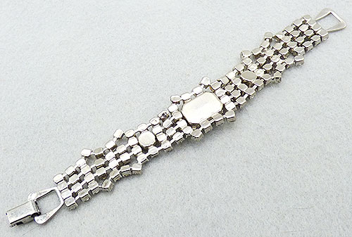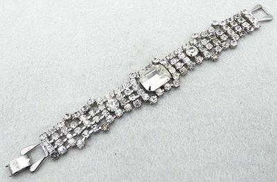 Description: Vintage 1950's silver tone clear rhinestone bracelet; a larger clear cushion cut rhinestone is in the center of four rows of clear rhinestone chains A curved row of rhinestone flank the center on either side and larger round rhinestones are on either side. Fold-over clasp.