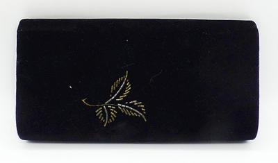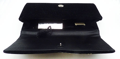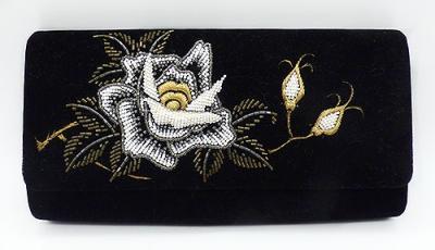 Description: Vintage black velvet handmade beaded and embroiled clutch purse, the stunning evening bag has a large beaded flower on the front. The white bead petals are edges with gradient silver-gray beads and the leaves are made with silver metallic bugle beads. The inside of the flower is embroidered with gold thread, as are the stems and the outline of the pair of white bead buds to one side. The back has a sprig of metallic bugle bead leaves. The front flap has a snap closure and the inside is black satin with a larger pocket in te back and slightly smaller pocket in the front. Original mirror on a black tasseled cord is inside back pocket. Sewn in tag stocked 'Guaranteed Hand Made' is on the back pocket.