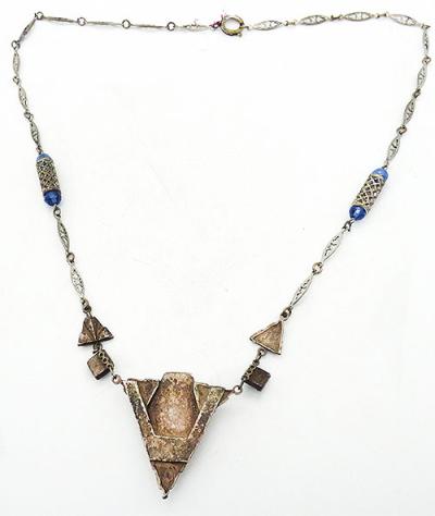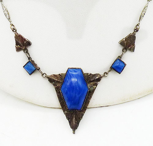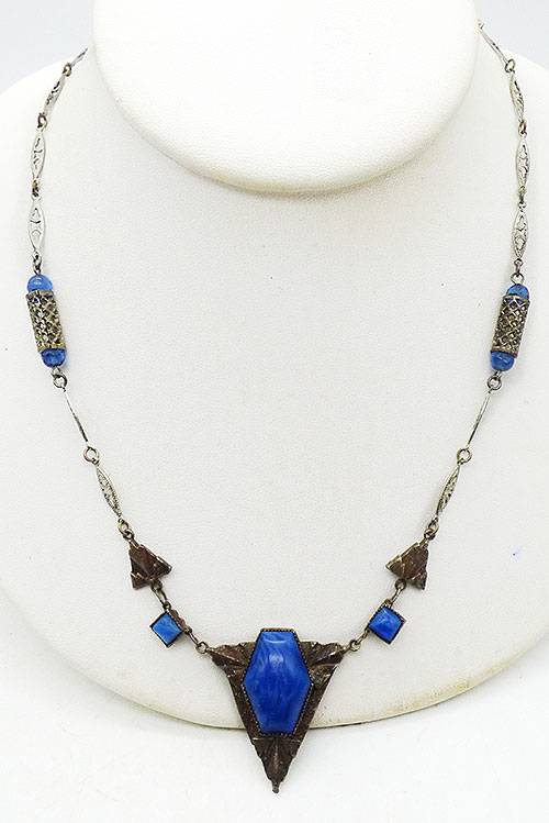 Description: Art Deco period silver metal and blue swirled glass necklace; the triangular centerpiece is set with a large blue glass hexagon stone which is then connected to square links set with square blue glass stones. Silver triangle links connect to silver filigree chan with a lattice filigree bead flanked by matching blue glass beads spaced halfway up the chain. Probably Czech.