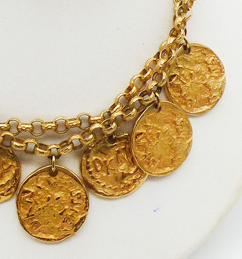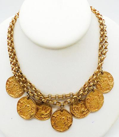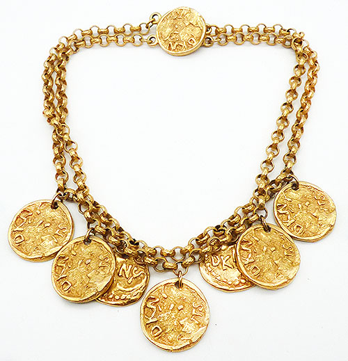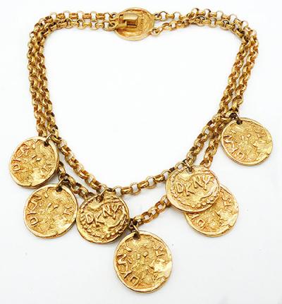 Description: DKNY gold plated coins vintage necklace; a double strand of round chain with dangling DKNY coin medallions. The coins are heavily textured and embossed with DKNY. There are three coins on the shorter chain, four on the longer chain, and one more at the top hiding the hook clasp. Signed '©DKNY' on the back of the clasp.