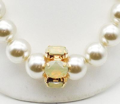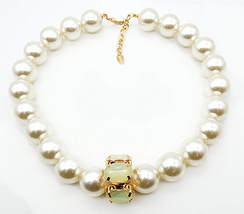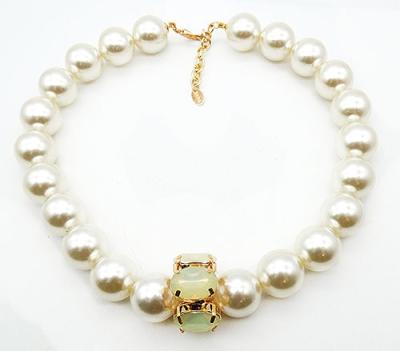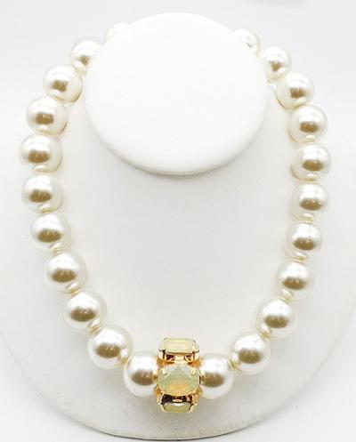 Description: Byba Bijoux Italian statement necklace; a single strand of oversized simulated pearls threaded through a a ring of large pale yellow opalescent acrylic oval stones in the middle. Gold tone setting for stones and for extender chain and lobster clasp. Signed 'Byba' on jan tag near clasp.