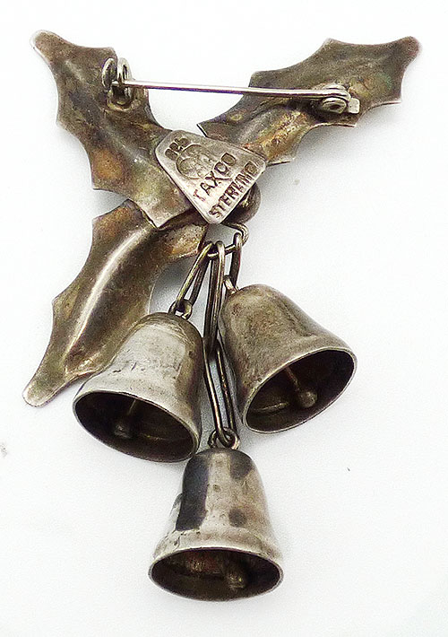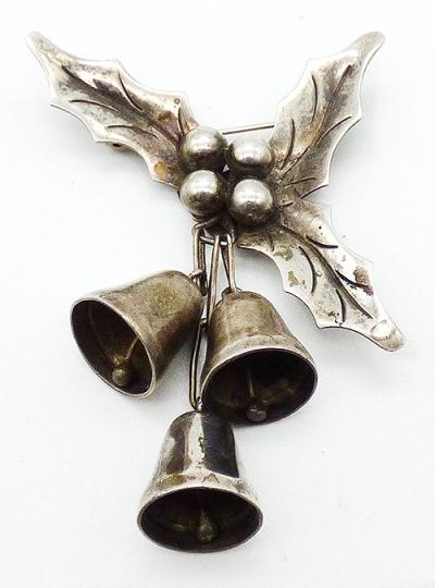 Description: Mexican Taxco vintage sterling silver Christmas holly and dangling bells brooch; a classic holiday design. Three ringing bells hang from three large holly leaves with a cluster of sterling berries in the center. Signed '925 Taxco Sterling' with a maker's mark 'DG' on the back.