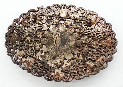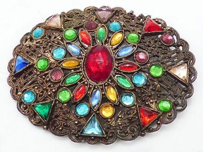 Description: Czechoslovakian antique brass filigree oval brooch set with a variety of glass jewels; an unusually large brooch with a red glass oval center surrounded by a row of blue, green golden topaz and red glass navettes. Green, aqua, amethyst and golden topaz round stones are between each navette. Larger glass triangles in all colors are along the outer edge with more smaller round stones. Attributed Czech.