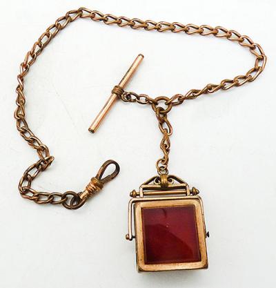 Description: Victorian gold filled watch chain and reversible locket fob; a thick square fob that hides a a locket that holds two photos. A reversible fob that flips between a square onyx stone on one side and a square carnelian stone on the other.