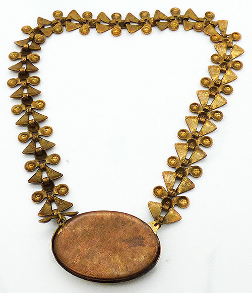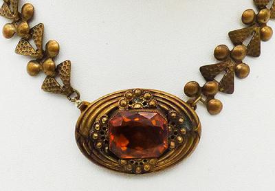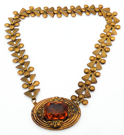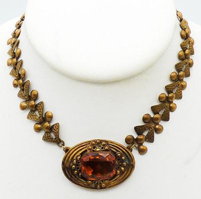 Description: Czech Art Deco amber glass and brass link necklace; the oval centerpiece has a large cushion cut amber glass stone in the center of a grooved frame and with filigree decoration on the sides. The chain is alternating links of hammered brass triangle pairs and brass bead trios. The chain clasps in front into the centerpiece with a hidden long push-in clasp.