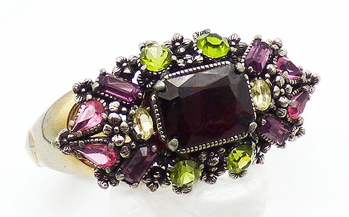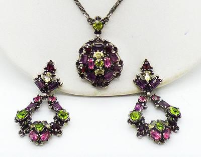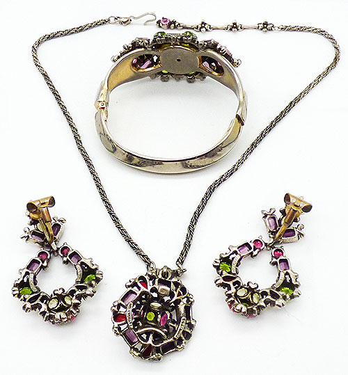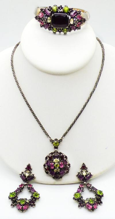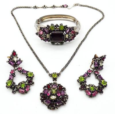 Description: Hollycraft vintage 1954 jeweled clamper bracelet, pendant necklace and dangling clip earrings; a bold departure from Hollycraft's usual pastel color palette. The top half of the side-hinged bracelet has a huge silver tone decorative element with a garnet rectangular glass stone in the middle, peridot green round rhinestones, smaller pale yellow ovals, larger amethyst baguettes and pink teardrop rhinestones fanning out from the center. Textured silver tone bead florets decorate in between the stones. The matching necklace has a pendnt with a domed center of alternating yellow and pink ovals around a peridot green center and alternating amethyst baguettes and ruby teardrops apunr the outer edge. It's on a thick silver tone twisted chain with floret extender chain. The earrings have different shapes of matching color rhinestones with the matching textured silver tone beads between and patented 'Gra-Loc' clips. Signed 'Hollycraft Corp 1954' on the back of both earrings and pendant.