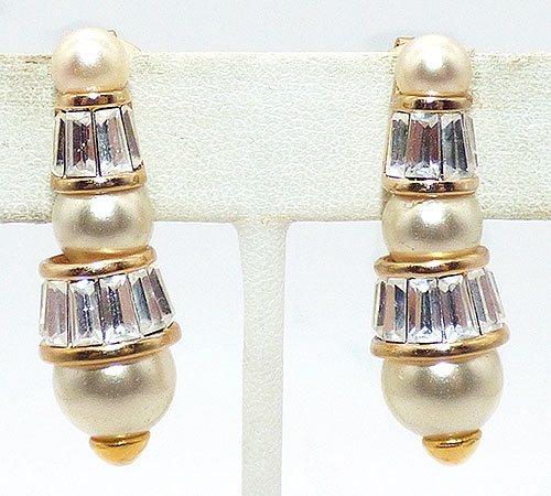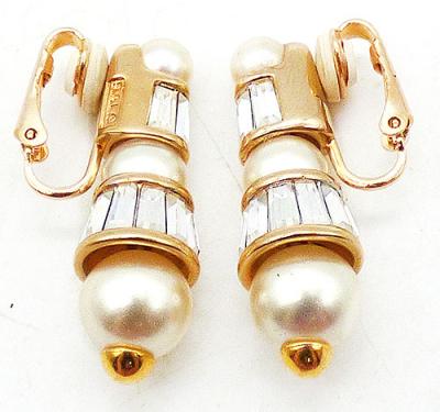Description: Swarovski vintage simulated pearl and crystal baguette gold plated clip earrings; stacked drops with bands of clear crystal baguettes alternating with graduated size glass pearls. Signed 'S.A.L.', Swarovski mark between 1977-1988.