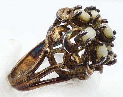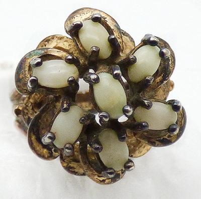Description: Joe Esposito sterling vermeil floral cocktail ring; the flower is set with off-white gemstone marquis cabochons, possibly white opals. It sits in a very tall tiered setting wth curls around each stone. Triple band and signed 'Espo Sterling' on the inside, mark for Joe Esposito.