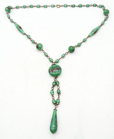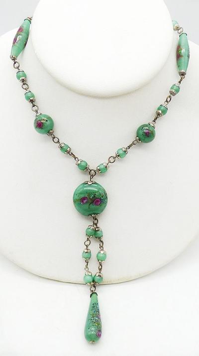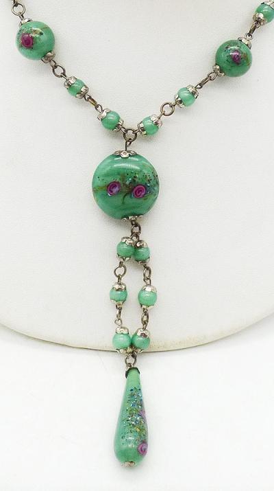 Description: Art Deco period green Czech satin glass bead flapper sautoir style necklace; the long drop is a sage green satin glass bead drop with pink flowers and darker green leaves hanging from a short double strand of round sage glass beads which in turn hang from a large, round, flat green bead with a pink flowers band around the middle. The necklace chain has individually linked green and pink flowers beads, round and elongated, spaced between smaller round green beads with silver tone end caps.
