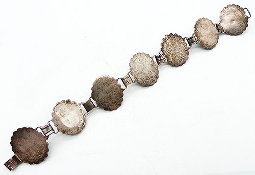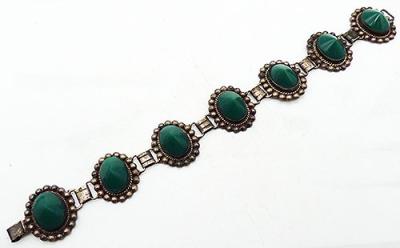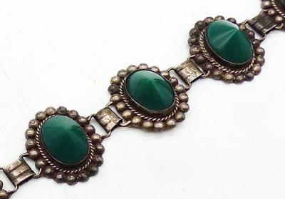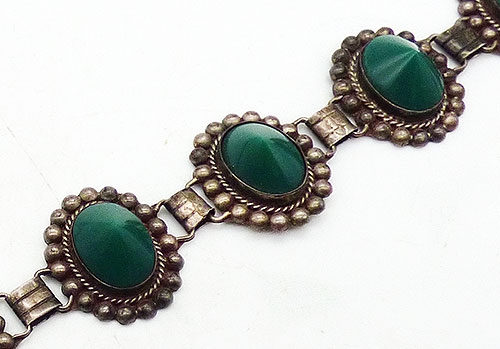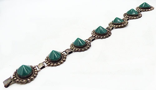 Description: Mexican vintage sterling silver and green onyx link bracelet; each of the tall pointed green oval pyramid stones, also known as Mexican jade, are set into a silver beaded oval links. Seven links in all with a plain hook clasp signed 'Sterling Mexico' on the back.