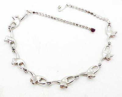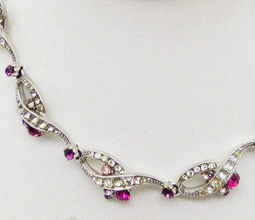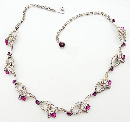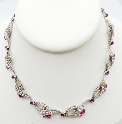 Description: Schiaparelli vintage rhodium plated rhinestone ribbon link necklace; looping ribbon links set with clear rhinestones and accented with lavender rhinestone and and fuchsia pink rhinestones where the ribbon ends curl. Amethyst rhinestones are set at the tip of each loop connecting the links. Clear rhinestone chain at the end of the eight links. Signed 'Schiaparelli' on the back of one link.