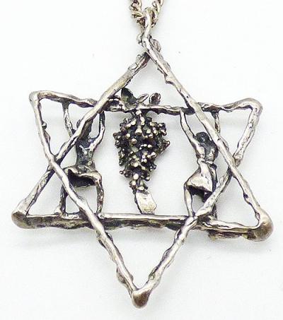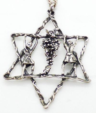 Description: Sterling silver oversized Star of David pendant; Joshua and Caleb carrying a cluster of grapes, a depiction of the story found in Book of Numbers when Moses sent twelve spies into the promised land. Hallmarked '925' on the bale.