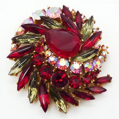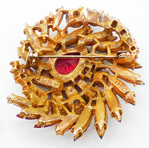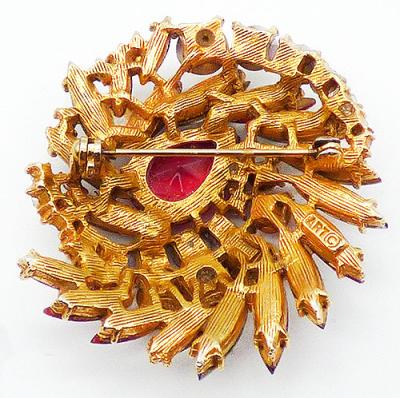 Description: Signed Art vintage gold plated red and black diamond (gray) rhinestone pinwheel style brooch;rows of graduated size red oval rhinestones and round pink aurora rhinestones curli into alternating red and black diamond thin navette rhinestones that all sprial around a large red teardrop stone in the middle. Signed 'Art©' on the back.