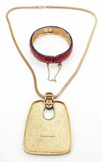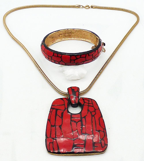 Description: Eisenberg vintage red and black enamel gold plated pendant necklace and hinged bracelet demi-parure set from the 1970's Artist's Series. Both pieces have bold red enamel with an abstract crackle pattern in black. The pendant is a slightly tapered door knocker style rectangle on a gold tone snake chain. The bracelet is hinged on the side with a hidden push-in clasp and safety chain. Both pieces signed 'Eisenberg©'.
