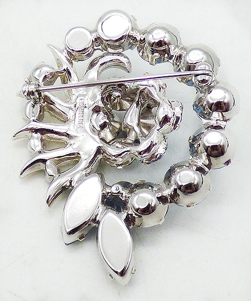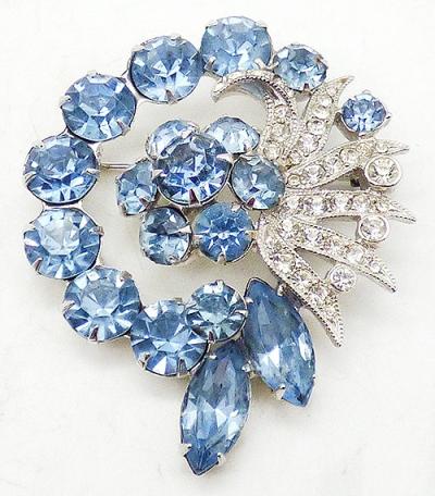 Description: Eisenberg vintage rhodium plated light blue rhinestone brooch; a central floret made with large light blue round rhinestones with a spray of clear rhinestone tendrils to one side and encircled by larger light blue round rhinestones and a pair of navette rhinestone at the bottom. Signed 'Eisenberg' (block letters) on the back.