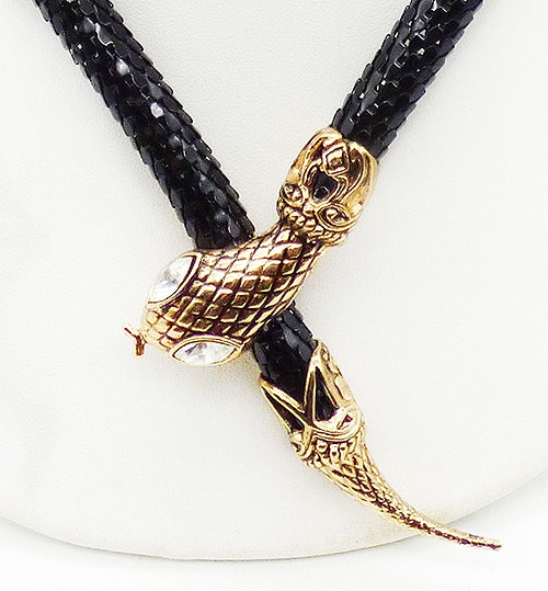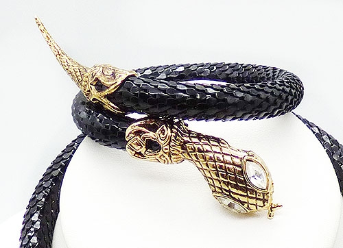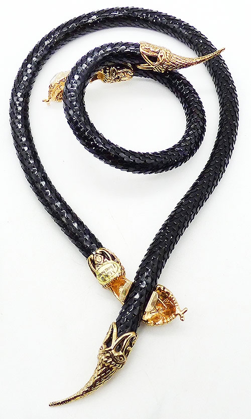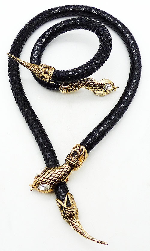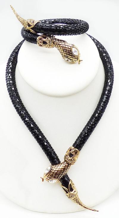 Description: DL Auld black enamel metal round mesh snake necklace and matching bypass wrap bracelet; both pieces have long bodies with mesh that looks like snake skin and gold tone cross-hatch texture heads and tails. Bot have clear rhinestone navette eyes. The necklace has a clip under its head that clasps over the round mesh. The bracelet is memory coil. Both pieces signed with the DL Auld triangular mark underneath the heads and the necklace has an original 'Made in Hong Kong' sticker on the back of the head.