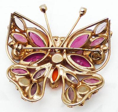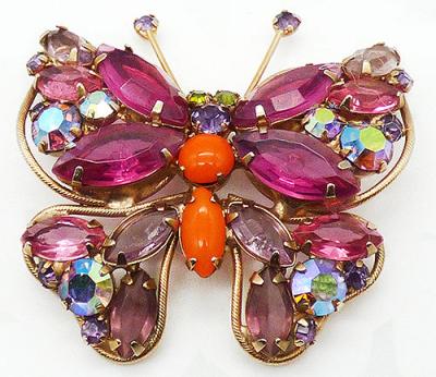 Description: Regency gold tone rhinestone butterfly brooch; the wings are filled with unfoiled pink and light amethyst rhinestone navettes, round medium vitrail auroras and small amethyst rhinestones. The stones are inside a textured gold tone wire border. The body is set with opaque orange glass navette and round cabochons, an amethyst rhinestone and a pair of olivine rhinestone eyes. Amethyst rhinestones are at the tips of the antenna. Attributed Regency.