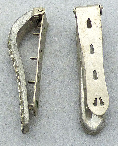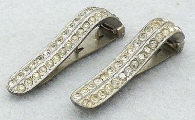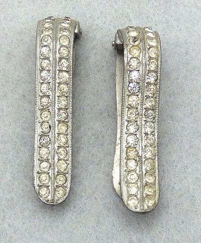 Description: Art Deco early 1930's pot metal clear rhinestone matching dress clips pair; each narrow clip is curved at the top for dimension and has two vertical rows of clear rhinestones.