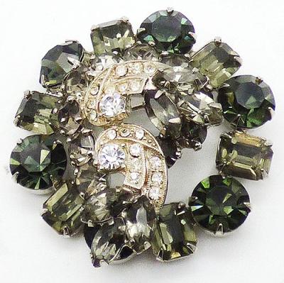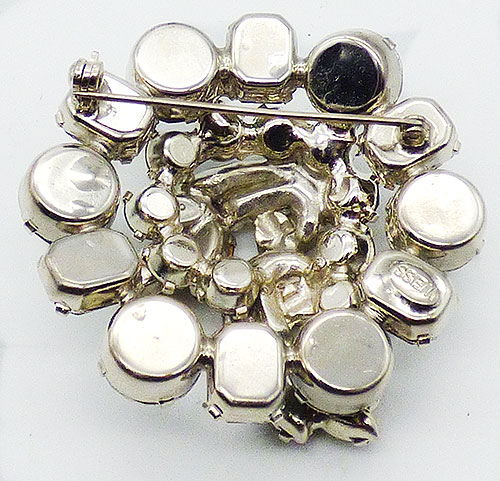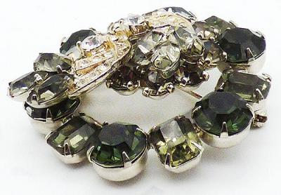 Description: Weiss vintage silver plated black diamond rhinestone tiered wreath brooch; a classic design with a base layer of alternating large square and round black diamond rhinestones, The top layer is a double ribbon swirl of clear rhinestone rows around a center clear round rhinestone, edged with a row of black diamond rhinestones and a trio of black diamond rhinestone navette's at each end. Signed 'Weiss' on the back.