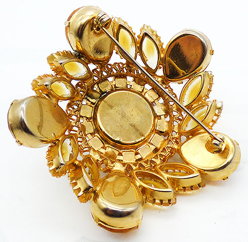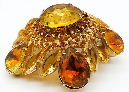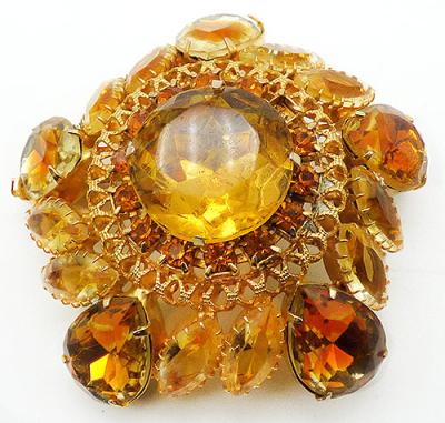 Description: Topaz and citrine glass and rhinestone highly domed gold plated brooch; a huge round citrine glass stone is at the top of the tall dome surrounded by a row of golden topaz rhinestones and then a pierced gold tone metal ring. The outer row has large bi-color topaz and citrine teardrop glass stones alternating with pairs of unfoiled citrine navettes.