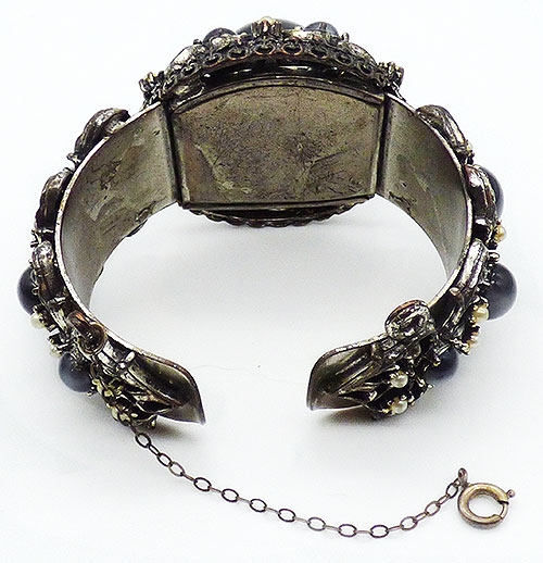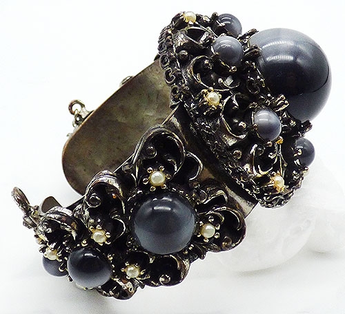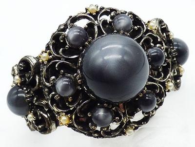Description: Sandor vintage ornate silver tone and charcoal moonglow lucite cabochon hinged clamper bracelet; the silver tone band is covered with an applied curling vine metal overlay. A humongous charcoal gray moonglow cabochon is in the center of the top section and is surrounded by smaller gray cabochons and accented with little faux pearls. The band is hinged on either side of the centerpiece and has graduated gray moonglows down the middle with more faux pearl accents. Silver tone safety chain at the opening. Attributed to Sandor.