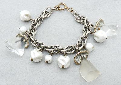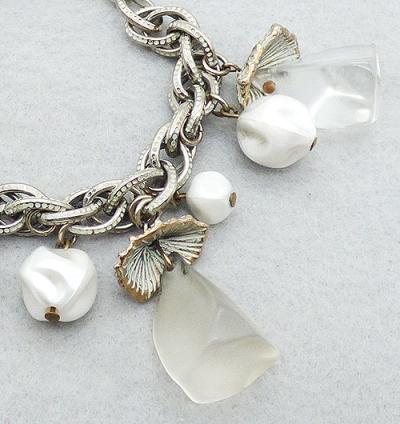 Description: Vintage lucite and white faux pearl charm bracelet; two sizes of white faux pearl nugget charms, two large clear lucite puramid charms and a single satin lucite charm all hang from a white washed silver tone twisted link chain. The lucite charms are inside oversized white washed ridged cups.