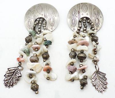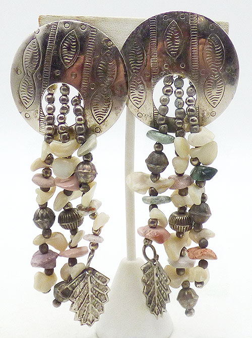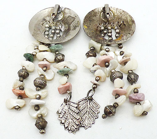 Description: Vintage Boho etched silver and mother-of-pearl bead dangle clip earrings; Three long strands of mother-of-pearl chip beads and silver beads hang from the center of a large etched silver tone disc. A single silver tone leaf hangs from one strand on each earring.