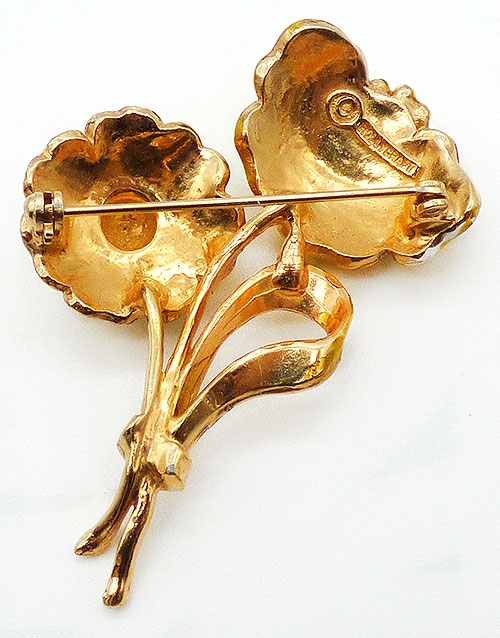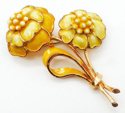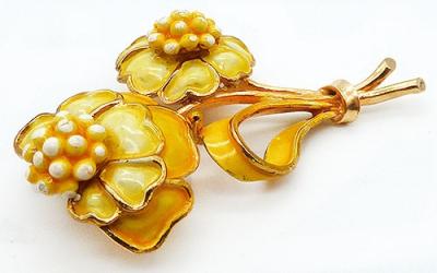 Description: Hollycraft vintage yellow enamel gold tone double flower brooch; the larger flower has two laters of petals, one canary yellow and one a lighter lemon yellow. The smaller flower's petals are the lighter yellow ad the ribbon loop is the darker shade. Both centers are bumpy clusters of stems in yellow with white dots on each. Signed 'Holycraft©' on the back.