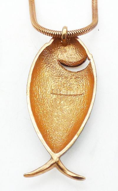 Description: Eisenberg vintage gold plated enameled fish pendant necklace from their 1970's Artists Series. The fish is large and his scales enameled in alternating rows of blue-green, navy blue, gray and turquoise. A row of clear rhinestones is below his head which is enameled in a lighter sage green with a clear rhinestone eye. His tail is polished gold tone and he comes on the original gold tone snake chain. Signed 'Eisenberg©' on the back.