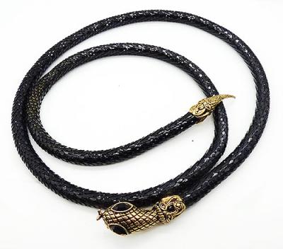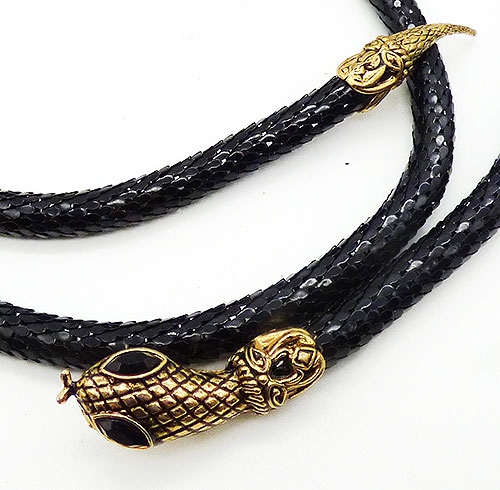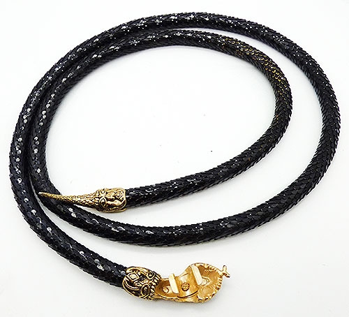 Description: DL Auld black enamel metal round mesh snake belt; a long body with mesh that looks like snake skin and gold tone cross-hatch texture head and tail with black rhinestone navette eyes. There's a clip under the head that clamps over the round mesh. Signed with the DL Auld triangular mark underneath the head.