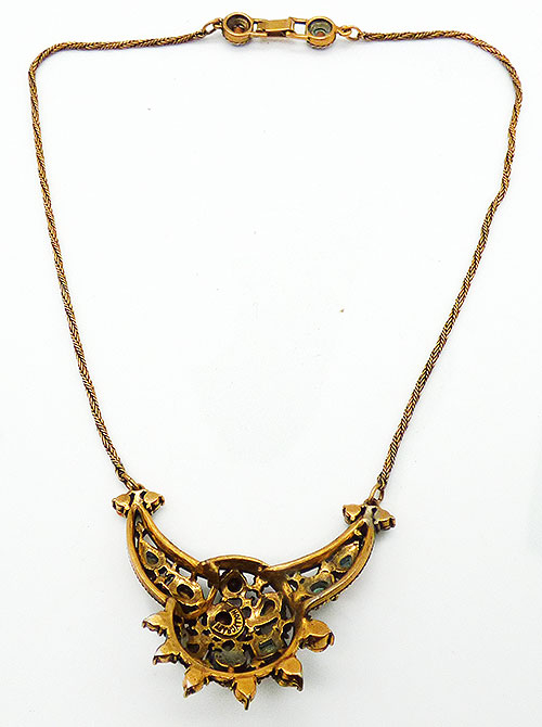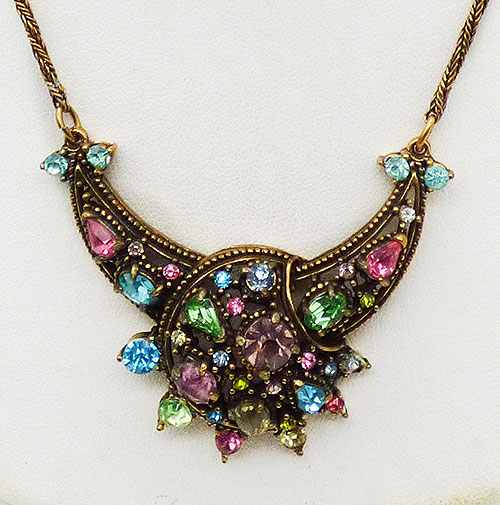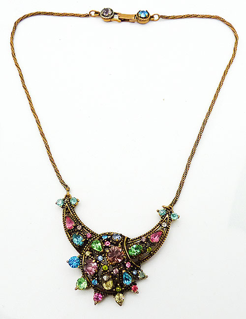 Description: Hollycraft vintage 1951 gold tone pastel rhinestone necklace; the centerpiece is a domed circle overlapping a crescent shape, all set with a variety of pastel rhinestones in different colors and shapes. The centerpiece is linked to a narrow gold tone twisted chain with a fold-over clasp andf a rhinestone on either side. Signed 'Hollycraft Corp 1951' on the back.