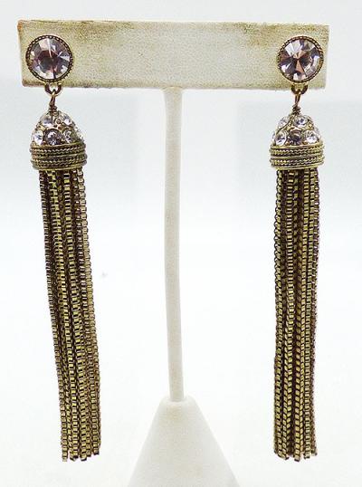 Description: Heidi Daus Clea crystal and gold tone chain long tassel pierced post earrings; fifteen square link chains from the tassel hanging from inside a dome of clear crystals. The tassel swings from a large round crystal at the post. Signed 'Heidi Daus CN' around the edge of the posts.