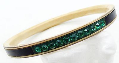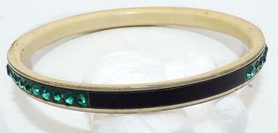 Description: Art Deco vintage celluloid narrow bangle bracelet wit rows of emerald green rhinestone alternating with sections of black enamel. Three groups of rhinestone, three sections of black enamel.