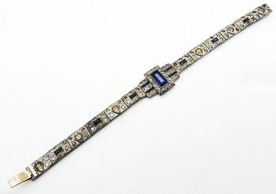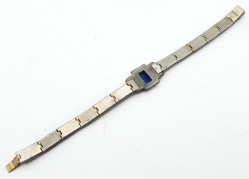 Description: Nov-E-Line Art Deco period silver base metal rhinestone bracelet; the center link has a large very dark navy or Montana blue baguette surrounded by clear rhinestones with alternating horizontal rows of clear rhinestones and smaller blue baguettes. The band has interlocking rectangular rhinestone links set a navy blue baguette in the center alternating or alternating with a diamond shape in the center. Hidden push-in clasp. Signed 'Nov-E-Line' on the back of the clasp.