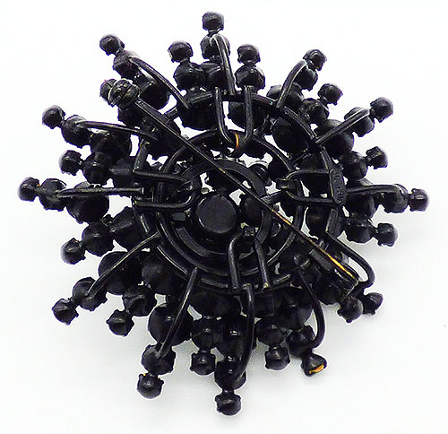 Description: Austrian vintage black japanned metal jet black and emerald green rhinestone starburst brooch; a large black round rhinestone surrounded by slightly smaller black rhinestones is in the center of three layers of short, medium and long rays, rhinestones on thick black wires. All of the rays are rows of black rhinestones tipped with an emerald green rhinestone at the ends. Signed 'Austria' on the back.