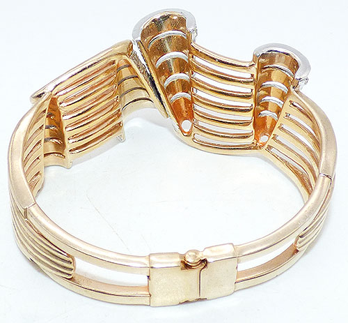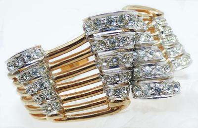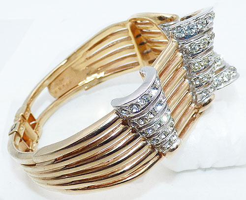 Description: Boucher vintage gold plated ribbon curls hinged bracelet; the style number dates this piece to 1955-1959. Six narrow gold tone ribbons curl across the top, the 3-dimensional curls set with rows of clear rhinestones. The ribbon bands merge and taper down to the hinge at the bottom, the bracelet opens at the top where the larger curls meet. Signed with the MB (Marcel Boucher) Phrygian cap mark inside the end in two places along with the style number 5411.