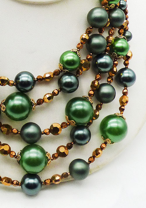 Description: Vendome vintage green faux pearl and copper crystal bead 5-strand necklace; graduated size green faux pearls, slightly smaller very dark green pearls and matte green pearls are separated with groups of larger and smaller copper crystal beads. The five strands are finished with the small copper crystals which attach to gold tone leaf connectors. Green pearl extender chain on one side, flower hook on the other. Signed 'Vendome' on the hook.