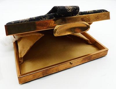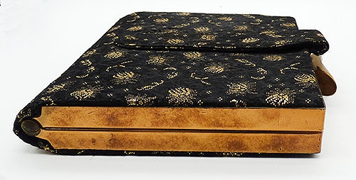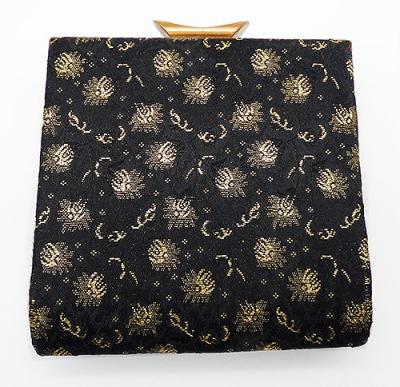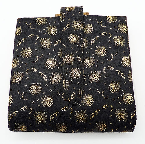 Description: Vintage black brocade and gold embroidery evening clutch purse, a square clutch with a wide hand strap pn one side. The purse is embroidered in an all-over gold metallic thread floral design. The frame is gold tone metal, as the the wide hinged clasp. The inside is a pale gold satin finish fabric with no pocket.