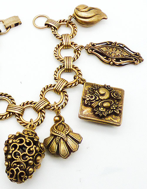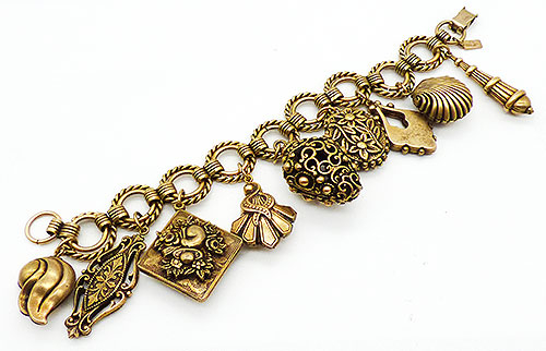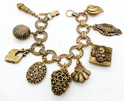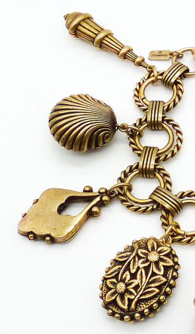 Description: Schiaparelli vintage gold plated chunky fobs charm bracelet; the nine large Etruscan style fobs are all different, the same front and back and hang from a double link chain, each round link has an outer twisted wire ring. Fold over clasp is signed 'Schiaparelli©' in block letters on a hang tag.