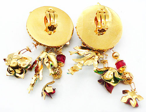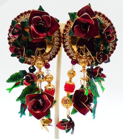 Description: Lunch at the Ritz Blooming Roses clip earrings; deep red enamel roses in different sizes, some more open than others, on beds of green enamel leaves. Three are on the large red glitter enamel gold tone disc at the top which is bordered with red and clear rhinestones. Three dangles hang from the disc; one with a red rose and green glitter leaves, one with a large rose at the end of a crystal bead strand and one smaller rose and the end of a gold and red bead strand. Signed 'Lunch at the Ritz' on the backs.