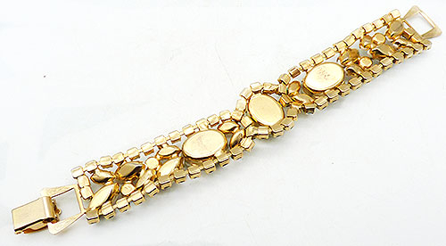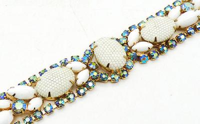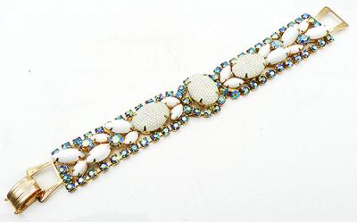 Description: Kramer vintage gold tone netted milk glass and aurora rhinestone bracelet; a flat bracelet with three large oval netted white milk glass cabochons and pairs of larger and smaller white milk glass navettes. A row of blue aurora rhinestones surround the center oval and are along the edges with larger auroras tucked between navettes. Gold tone golf-over clasp. Attributed Kramer.